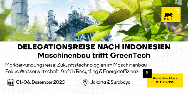 Vom 1. bis 6. Dezember 2025 findet eine vom baden-württembergischen Wirtschaftsministerium geförderte Delegationsreise nach Indonesien statt. Im Fokus stehen Zukunftstechnologien im Maschinenbau, insbesondere in den Bereichen Wasserwirtschaft, Abfall/Recycling und Energieeffizienz.