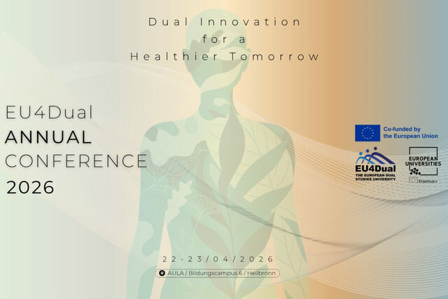 Als Teil der EU4Dual richtet die Duale Hochschule Baden-Württemberg (DHBW) am 22. und 23. April 2026 gemeinsam mit acht europäischen Partnerhochschulen die EU4Dual Annual Conference in der Aula des Bildungscampus Heilbronn aus. Die Konferenz steht unter dem Leitthema „Dual Innovation for a Healthier Tomorrow“ und bietet Keynotes sowie interaktive Workshops.