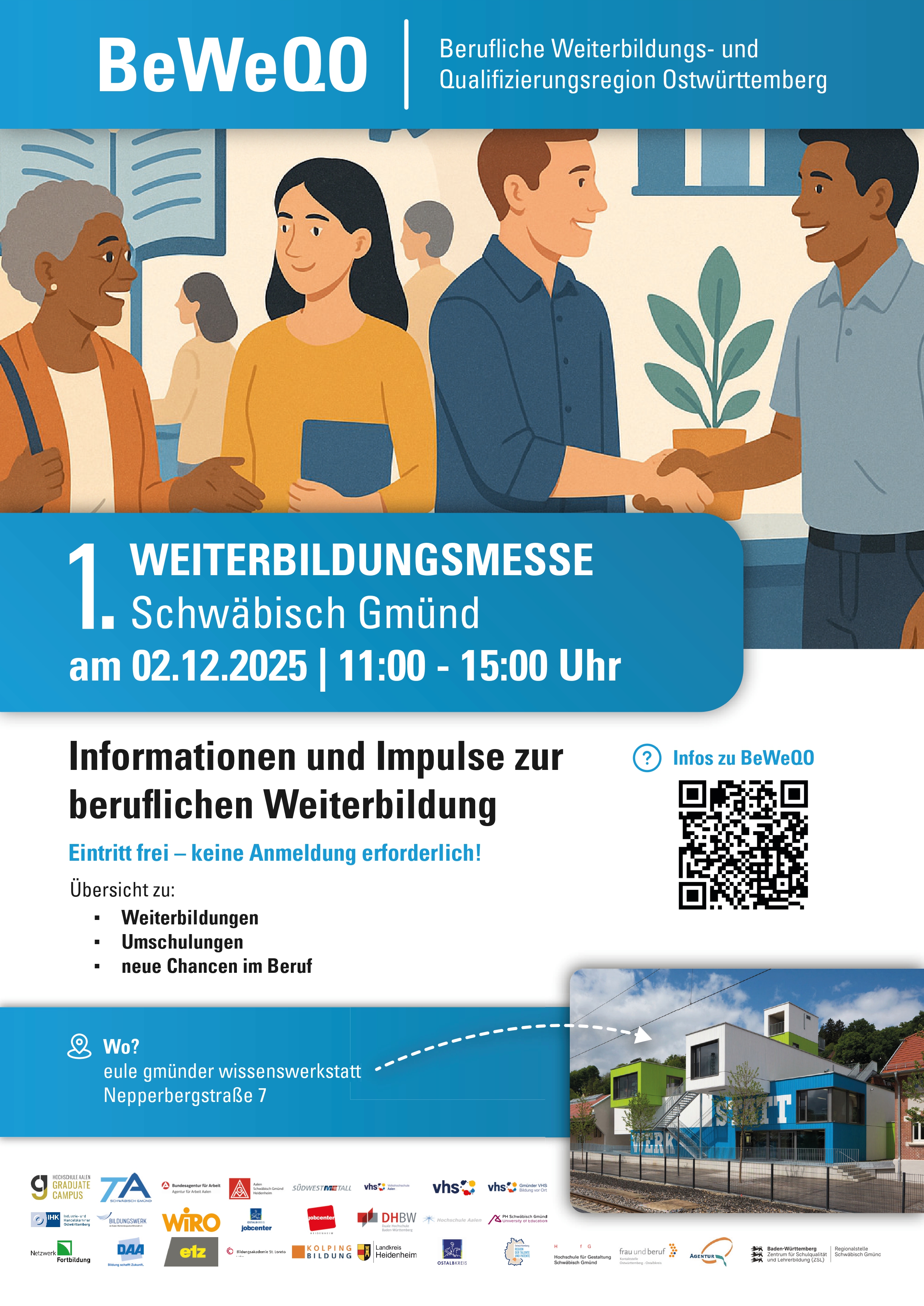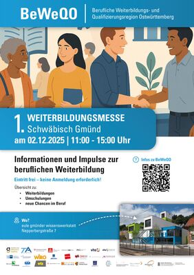 Die Berufliche Weiterbildungs- und Qualifizierungsregion Ostwürttemberg (BeWeQO) lädt am 2. Dezember 2025 zur 1. Weiterbildungsmesse Schwäbisch Gmünd ein. Die Veranstaltung findet von 11 bis 15 Uhr in der eule gmünder wissenswerkstatt, Nepperbergstraße 7, statt. Der Eintritt ist frei, eine Anmeldung ist nicht erforderlich.