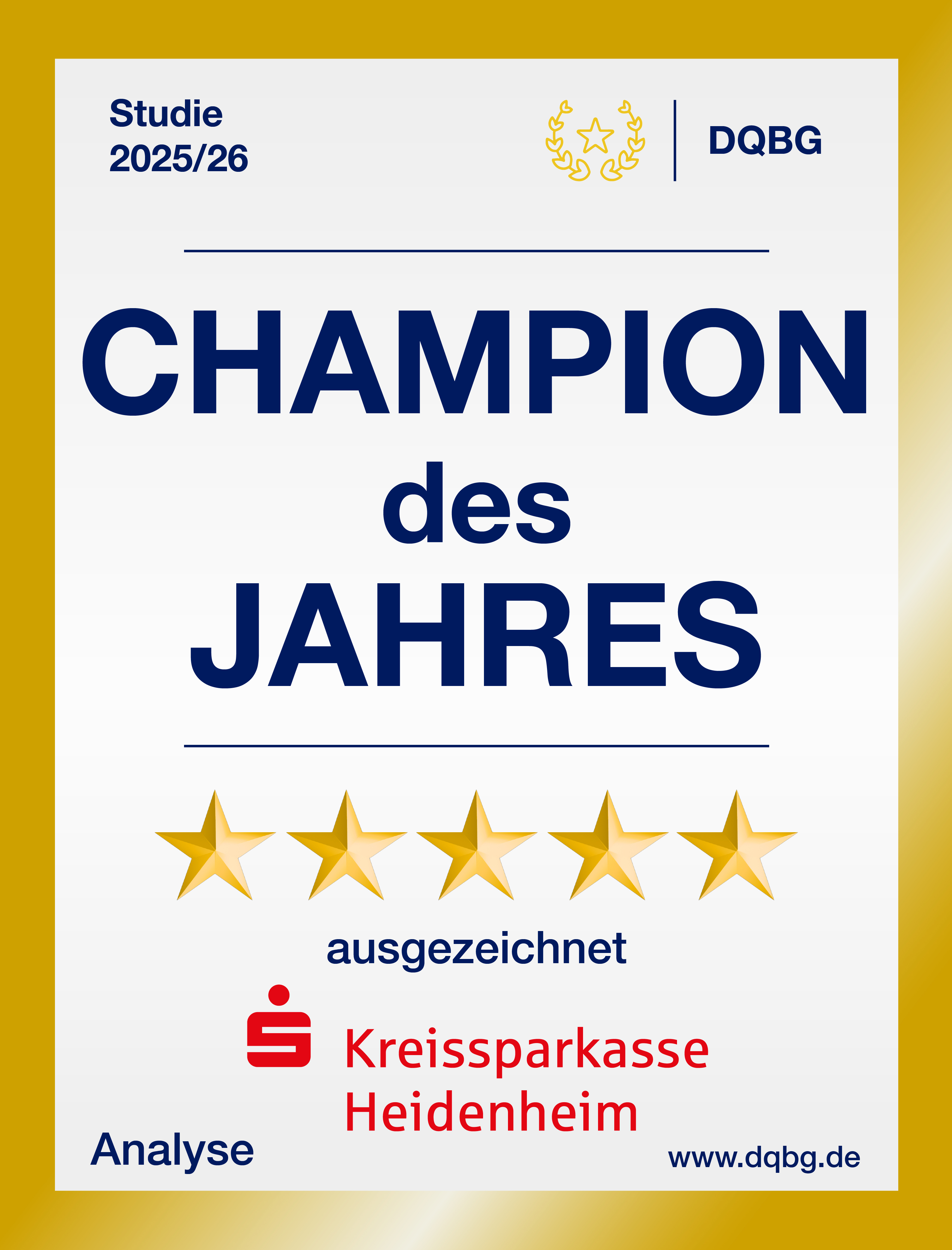 Die Kreissparkasse Heidenheim wurde vom Analyseinstitut DQBG – Deutsche Qualitäts- & Bewertungsgesellschaft – als bundesweiter „Champion des Jahres“ ausgezeichnet. Prämiert wurden Leistungen in vier zentralen Zukunftsfeldern: Nachhaltigkeit, Vertrauen, Servicequalität und Arbeitgeberattraktivität.