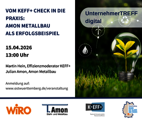 Wir möchten Sie recht herzlich zum UnternehmerTREFF digital „Vom KEFF+Check in die Praxis: Amon Metallbau als Erfolgsbeispiel" einladen.