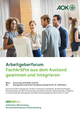 Das Forum findet in Kooperation mit dem Landratsamt Ostalbkreis, der Wirtschaftsregion Ostwürttemberg, der IHK Ostwürttemberg, dem Welcome Center Ostwürttemberg, der Agentur für Arbeit sowie dem Bildungswerk der Baden-Württembergischen Wirtschaft e. V. statt. Mehr Infos und Programm unter: https://www.welcome-center-ostwuerttemberg.de/veranstaltungen/details/arbeitgeberforum
